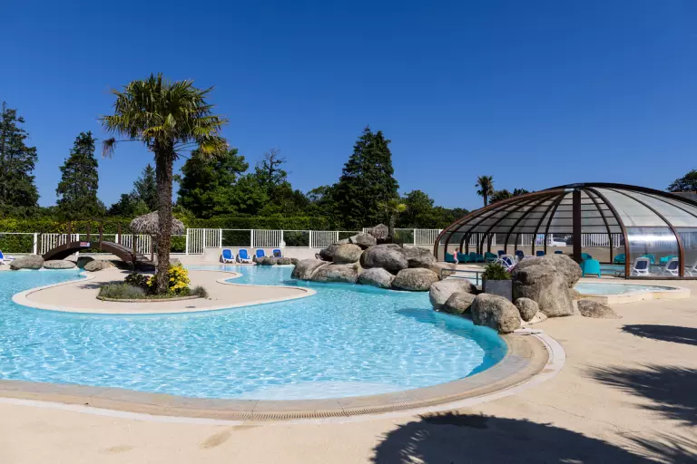 Le camping dispose d'un espace aquatique comprenant des piscines couvertes et chauffées ainsi qu'un espace extérieur accessible en saison. Les espaces couverts sont généralement ouverts d'avril à septembre, tandis que les équipements extérieurs, dont les toboggans aquatiques, sont accessibles en juillet et août, selon les conditions météorologiques.