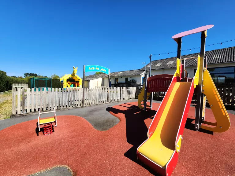 Une aire de jeux pour enfants, avec toboggans, balançoires et trébuchets attend vos enfants.